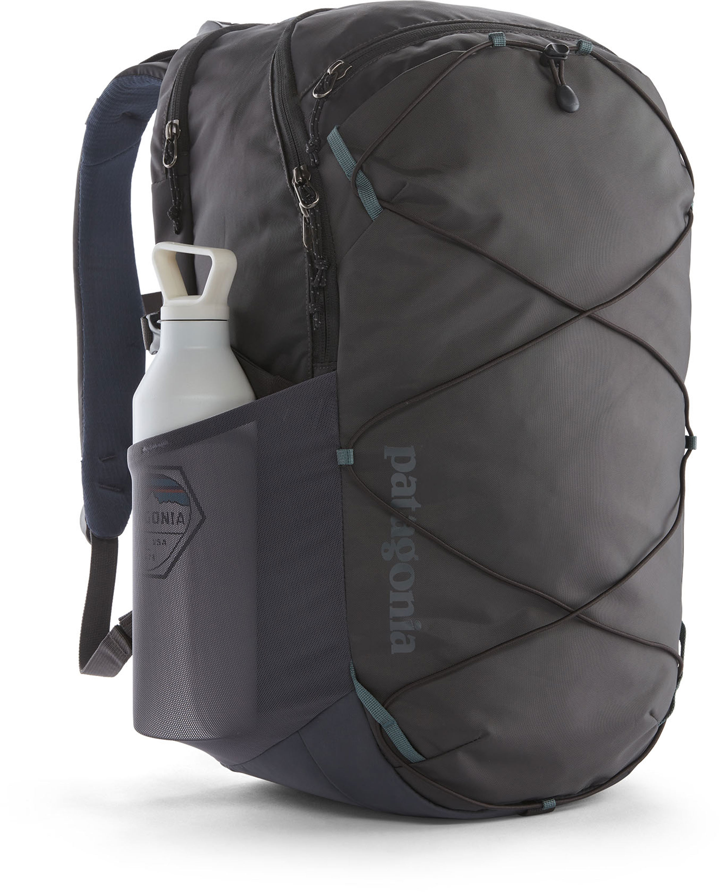 Made of 100% Recycled Polyester: To resist light moisture, this 30-liter pack is treated with a durable water repellent (DWR) finish made without intentionally added PFAS; all fabrics are 100% recycled except the stretchy mesh for the side pockets, which is a 72% recycled nylon/28% spandex blend